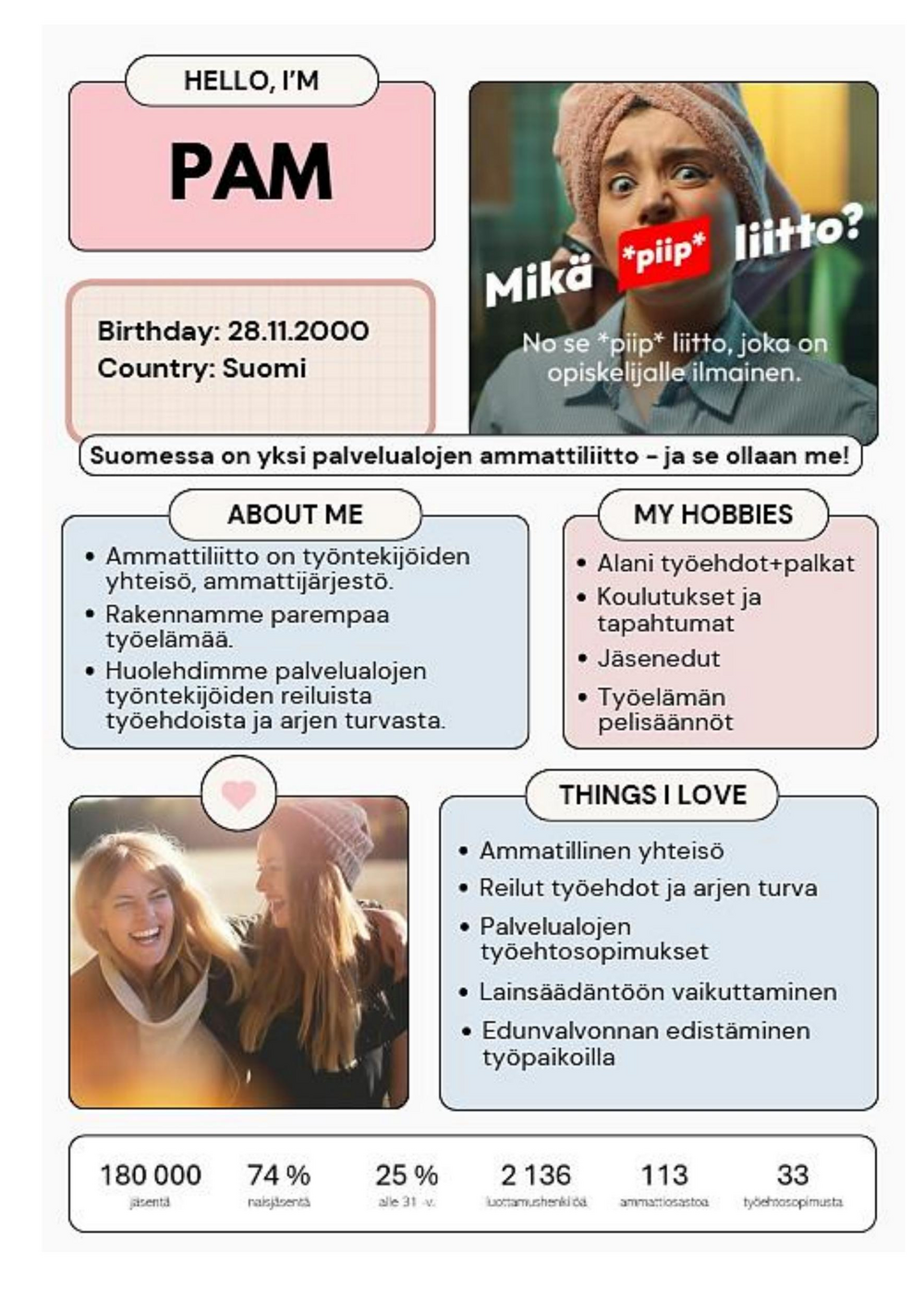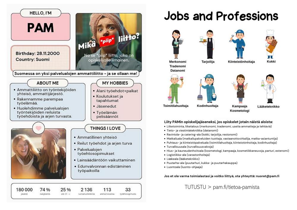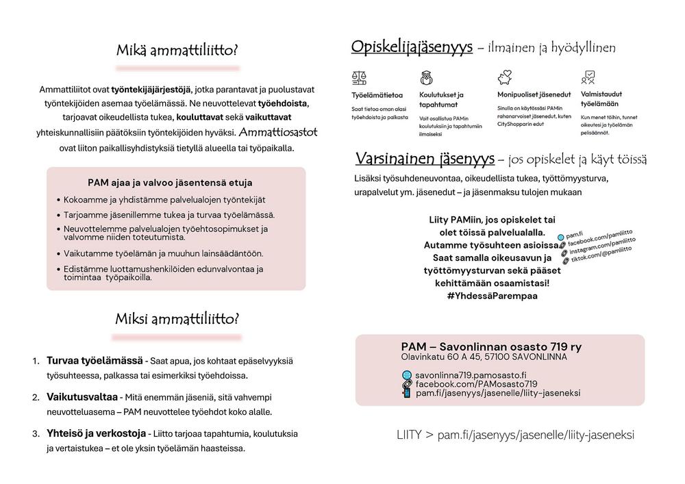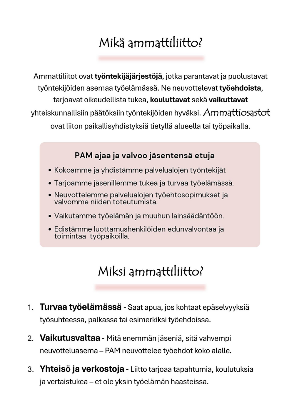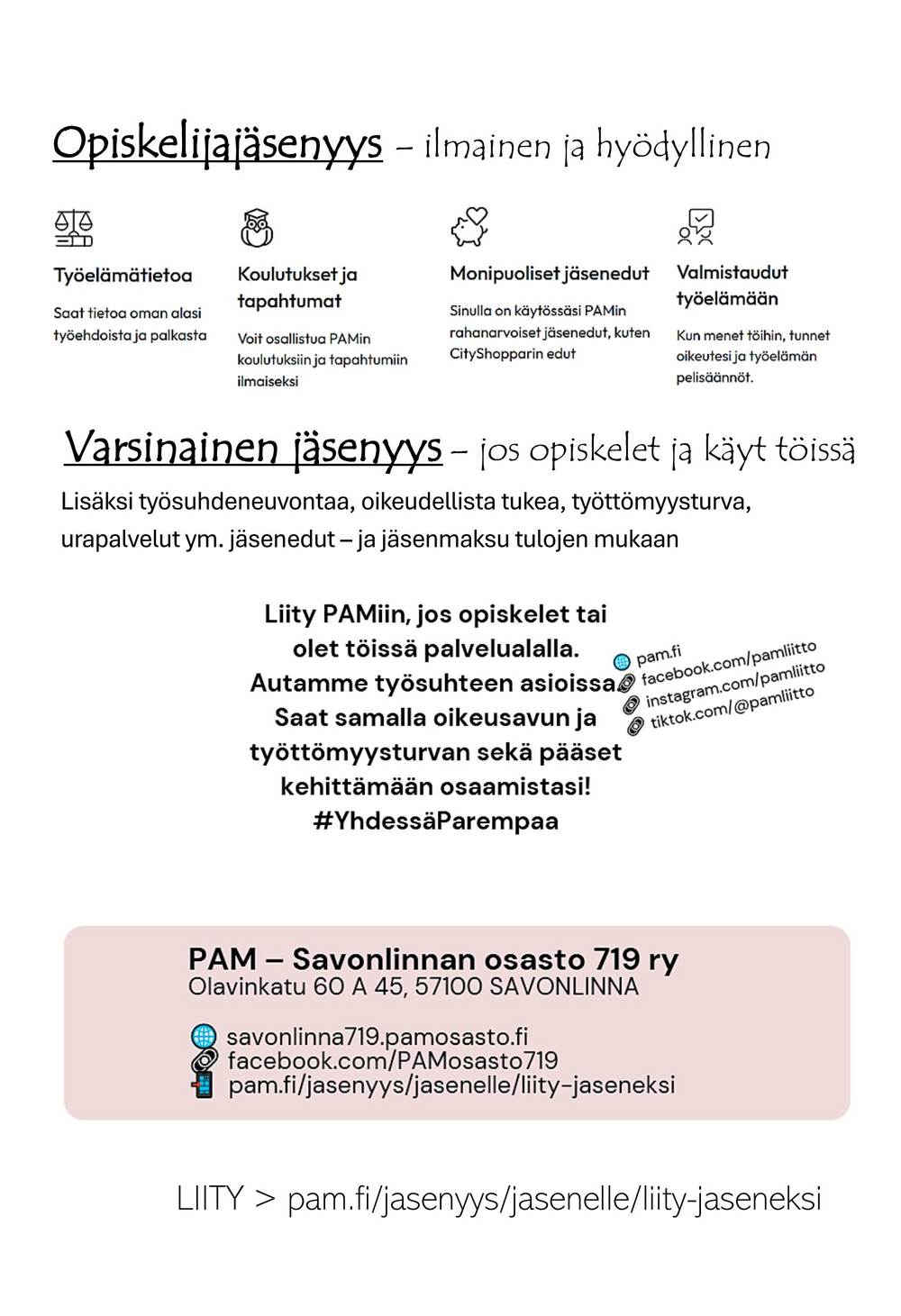 sinun kannattaa liittyä varsinaiseksi jäseneksi ja maksaa jäsenmaksua palkkatuloistasi. Kerrytät työssäoloehtoa, joka on edellytys ansiosidonnaiselle työttömyysetuudelle. Huomaa, että kun valmistut, voit vaihtaa liittoa (työalalle, jolla työskentelet) ja PAMin jäsenyyden aikana kerryttämäsi työssäoloehto seuraa mukana.