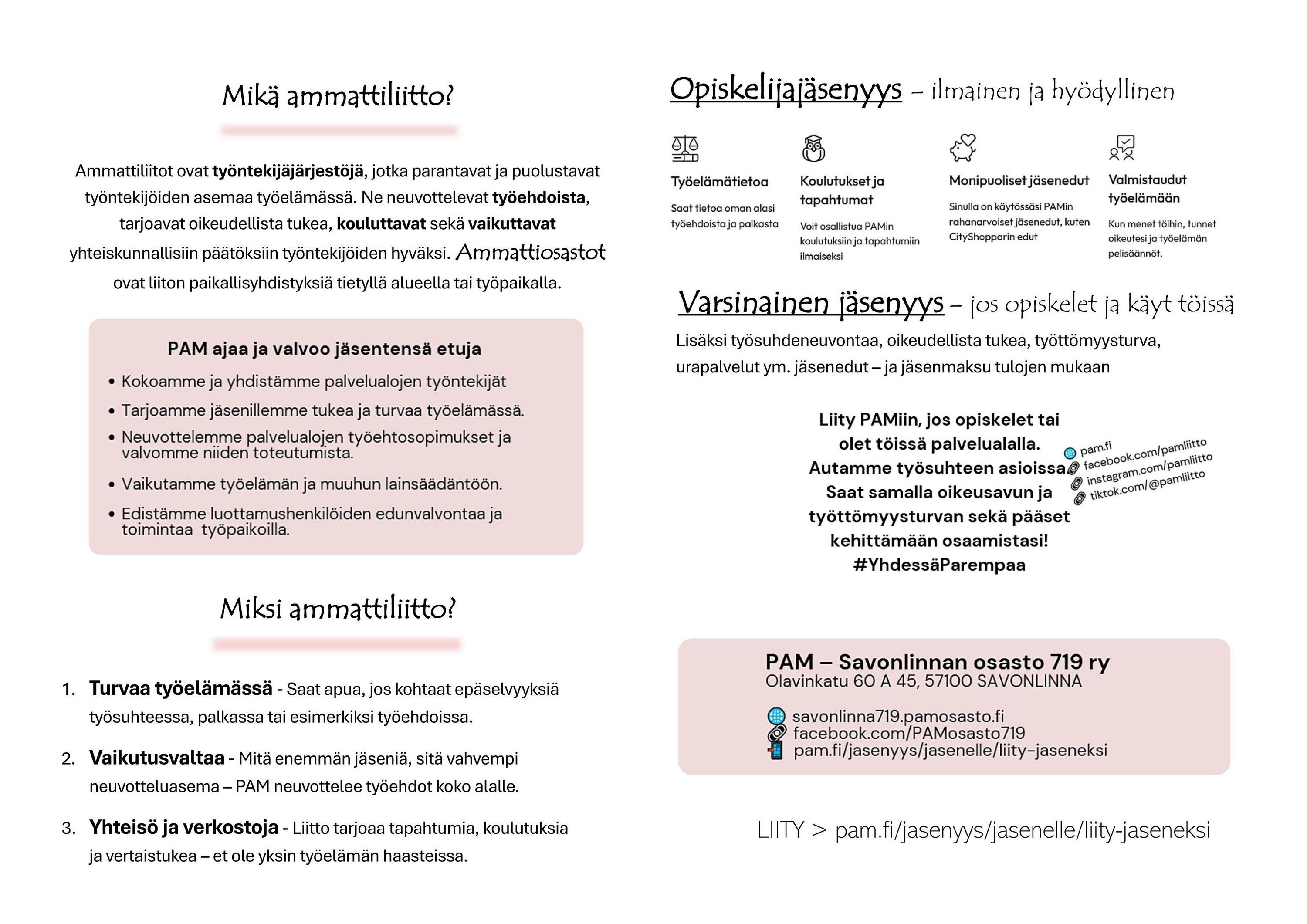 sinun kannattaa liittyä varsinaiseksi jäseneksi ja maksaa jäsenmaksua palkkatuloistasi. Kerrytät työssäoloehtoa, joka on edellytys ansiosidonnaiselle työttömyysetuudelle. Huomaa, että kun valmistut, voit vaihtaa liittoa (työalalle, jolla työskentelet) ja PAMin jäsenyyden aikana kerryttämäsi työssäoloehto seuraa mukana.
